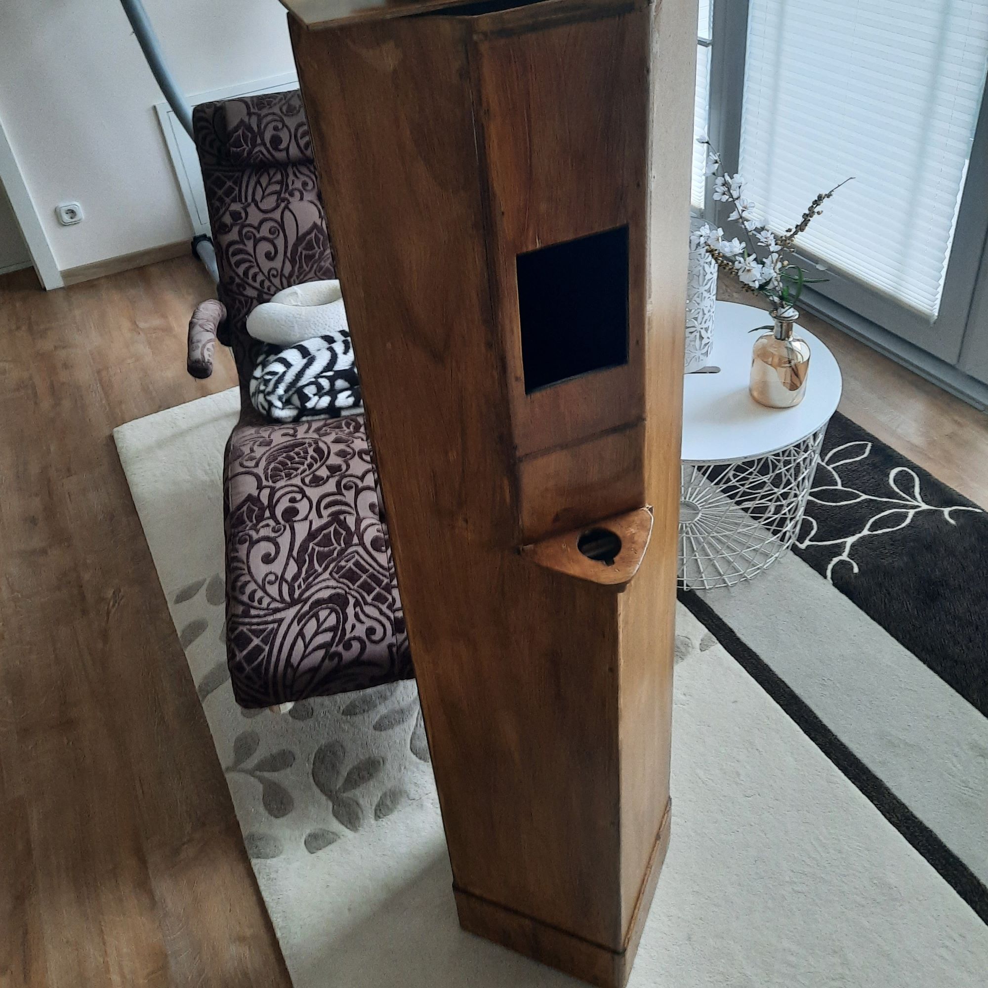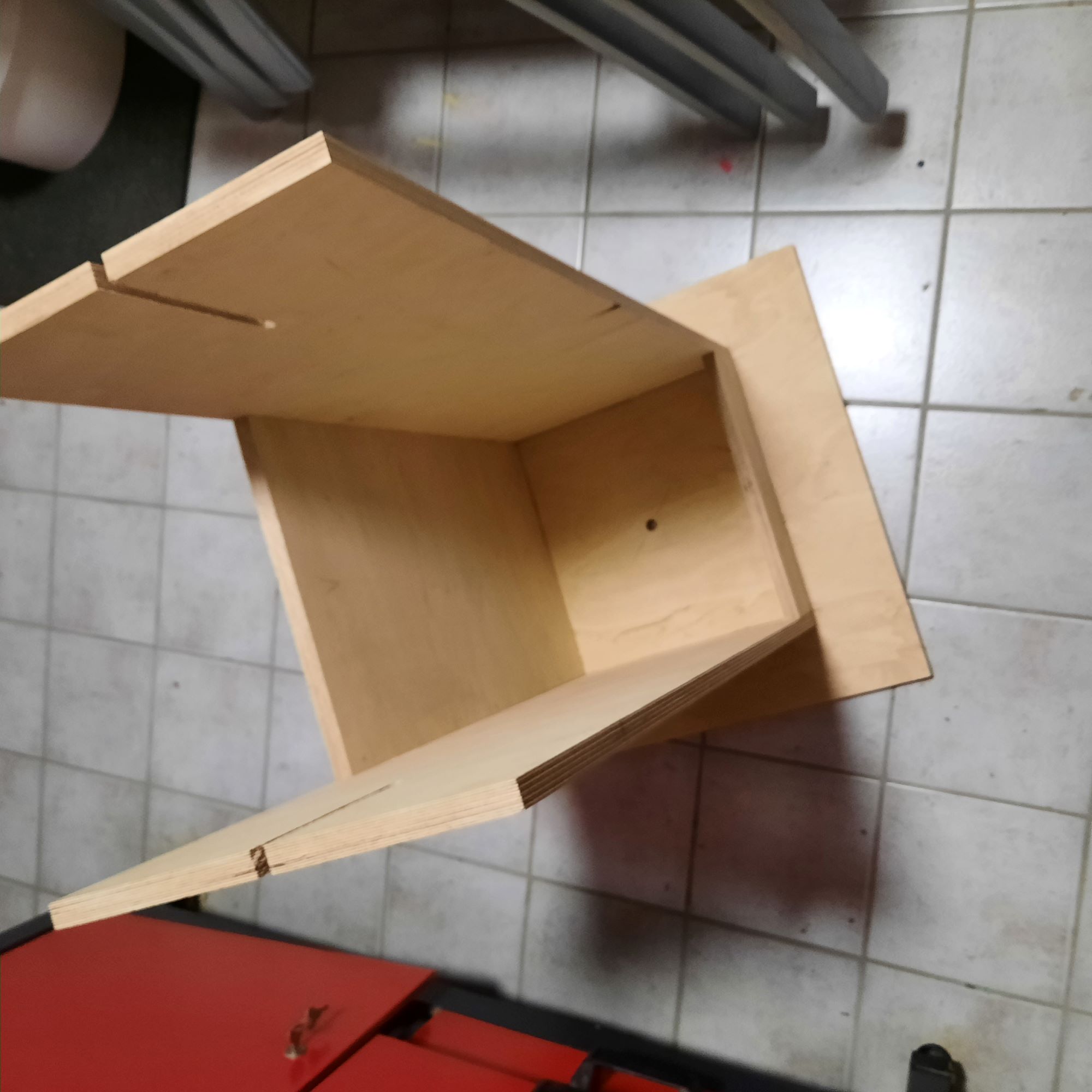Letztlich macht sich ein quadratischer Tubus mit runden Öffnungsblenden in einer quadratischen Rockerbox gar nicht mal schlecht, ich habe z.B. gleich die passenden Reibungsflächen für die Höhenlagerung mit dosierbarem Andruck. Der Schlitten kommt auf eine Ecke, sodass die Okularaufnahme ab etwa 8 Zoll Öffnung günstigstenfalls sehr wenig bis gar nicht über die Grundmaße des Dobsons hinausragen muss.