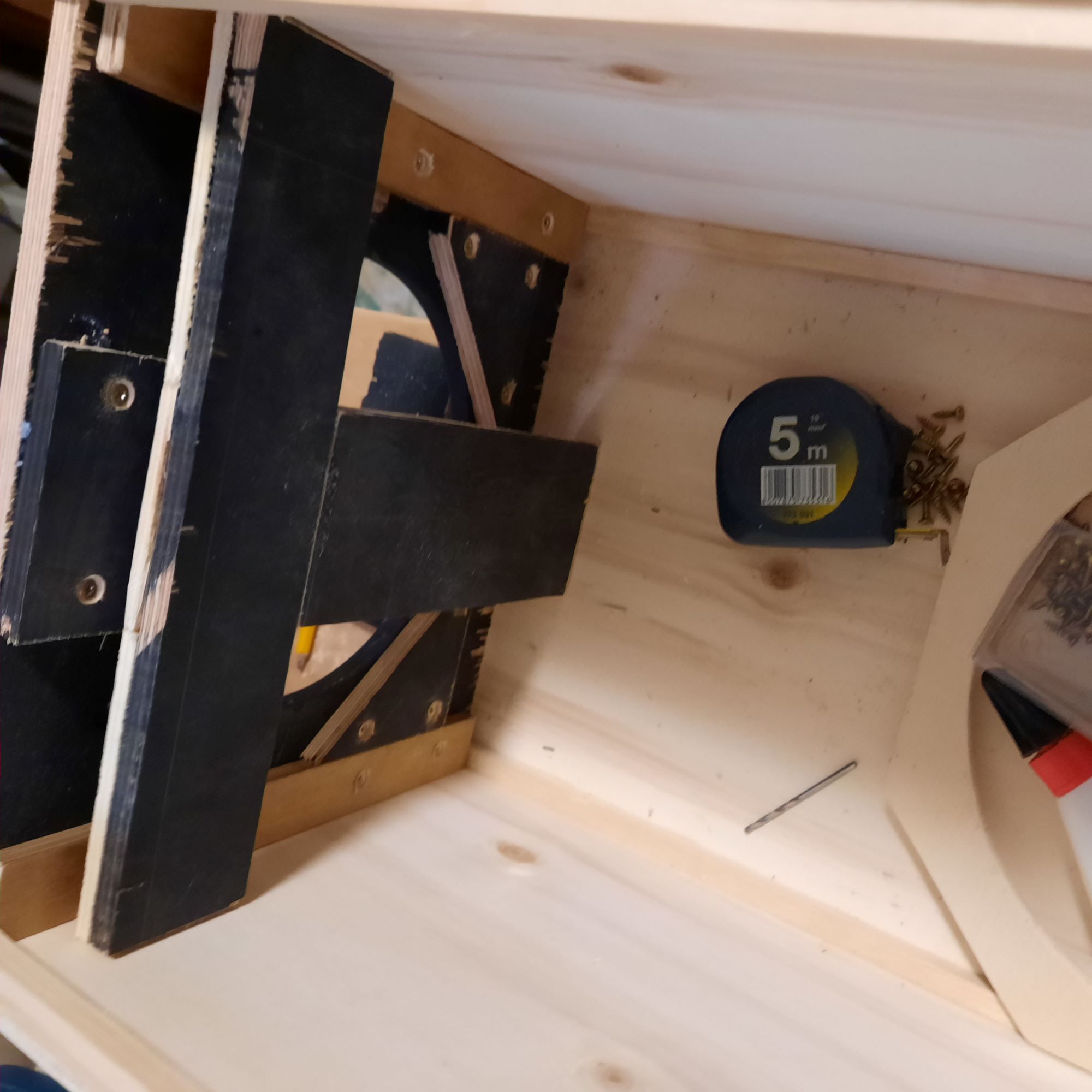 Den 6 Zoll plus 12 Zoll Dobson, weiter oben im Bild links zu sehen, habe ich ja im Bereich Equipment hinlänglich beschrieben. Ein Detail fehlte jedoch lange und das ist die Ablage an der Vorderseite der Rockerbox.