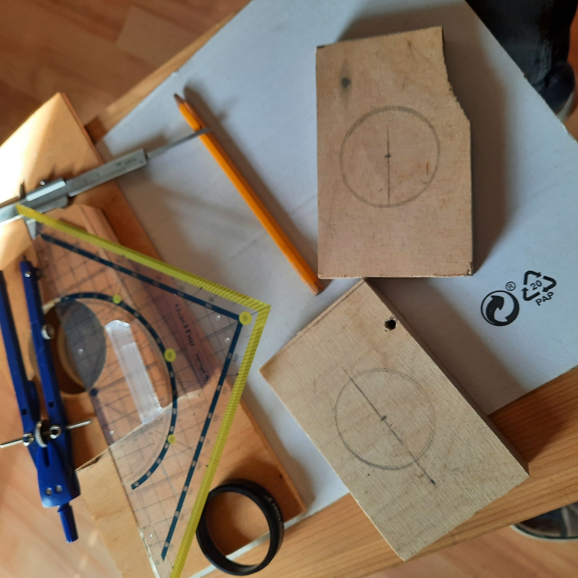 Die Grundplatten aus 14 mm Birke-Multiplex lasse ich im Baumarkt auf 500x500 mmzuschneiden, die Seitenwangen und das Frontbrett auf 800x300 mm, die Einkürzung des Frontbrettes, den Zuschnitt der rückseitingen Versteifung und weiter Anpassungen kann ich, wei beim Tubus auch, mit Kreis- und Stichsägen zu Hause erledigen.