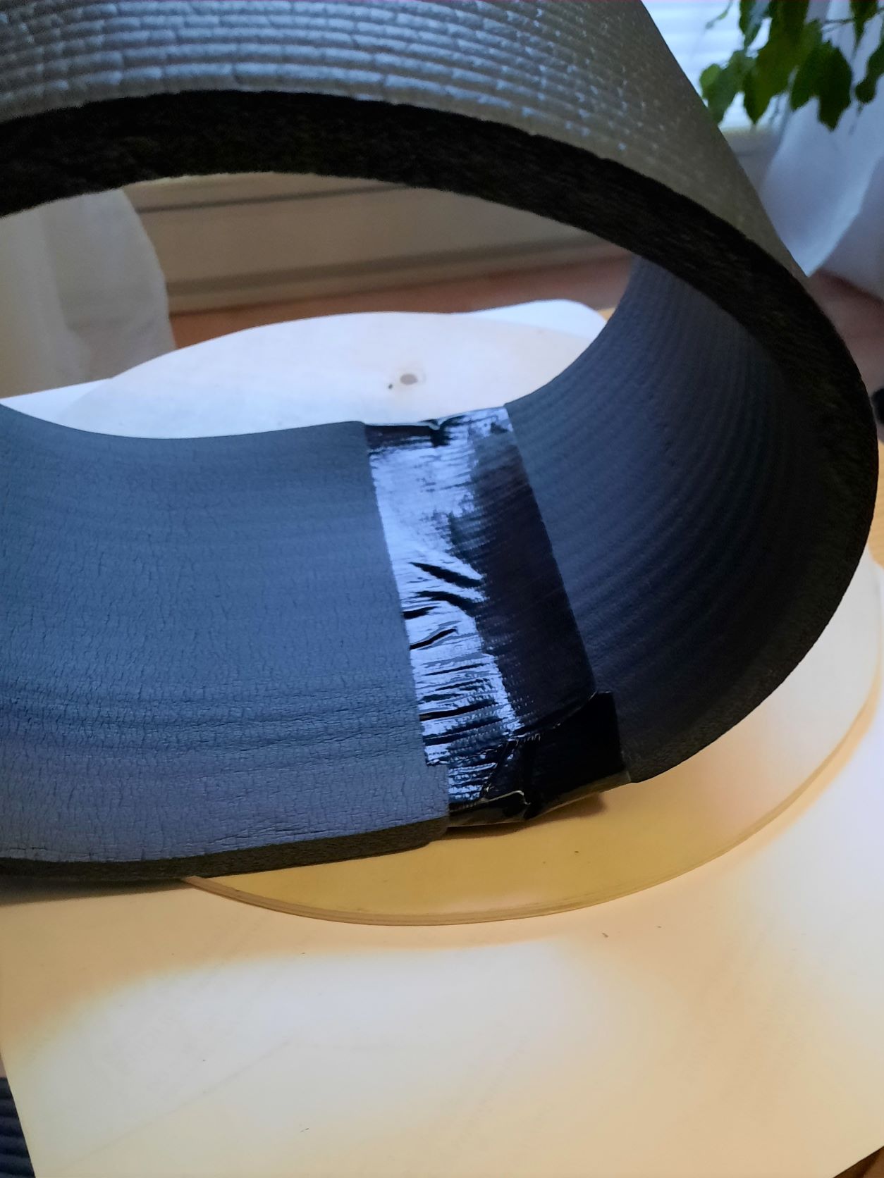 Anschließend wird am Schnitt, innen wie außen eine vollständige Klebebandschicht aufgebracht. Bei so breitem Klebeband wie ich es verwende, kann man schon ein wenig auf die spätere runde Form achten, klebt man das flach auf dem Tisch liegend, zieht man den Schaumstoff in eine gerade Form, die Taukappe eiert dann vorne immer ein wenig, auch wenn sie hinten am Tubus rund aufgesteckt ist.