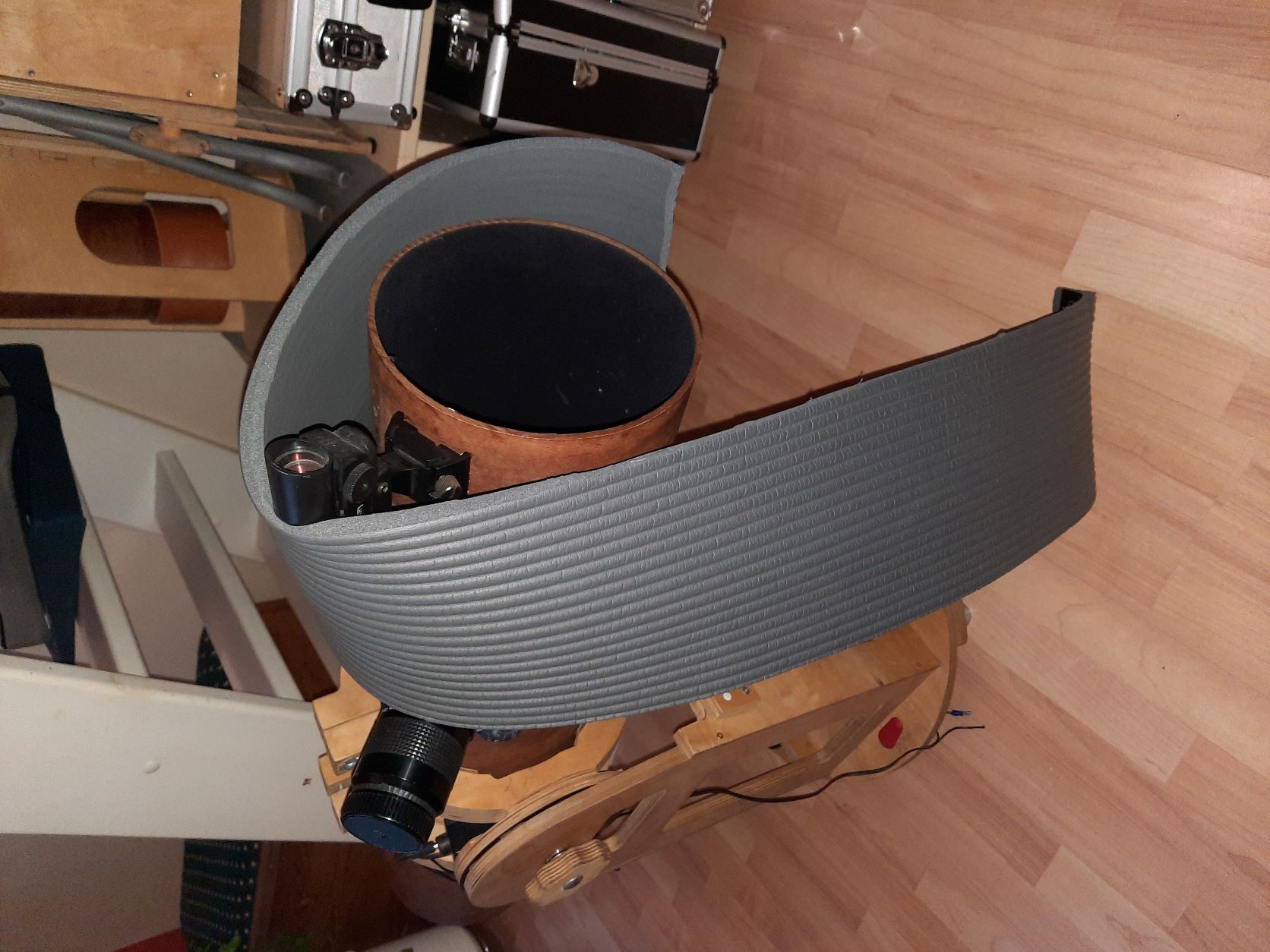 Der Materialverbrauch bei einem 12-Zöller ist nicht zu verachten, dennoch blieb ein längerer Streifen übrig und der reichte locker, auch meinem 6 Zoll f/4,8 Newton-Dobson eine Tau-/Störlichtkappe zu verpassen. Dabei kam mir dann auch rechtzeitig die Idee, das simple Vorhaben und seine Umsetzung nochmal zu dokumentieren.