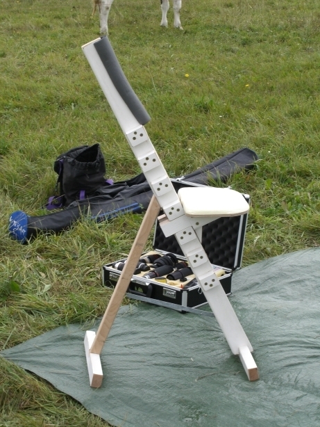 Zurück zum Stuhl. Einige vorhandene Hartholzlatten, Rasterung für die Höhenverstellung des Sitzbretts durch beidseitig auf der Hauptstange aufgeschraubte Klötze, ausklappbarer Stützfuß mit Spreizstange, Sitzbrett aus Multiplex mit aufgeklebter Platte aus Hartstyrodur. Dieses Material ist leicht trocken zu halten, wird aber selbst in nassem Zustand oder bei Frost sehr schnell warm wenn man sich darauf setzt.