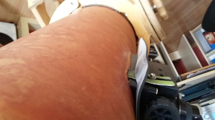 Später kamen noch, zwecks besserer Handhabung, zwei Verbindungsgurte (Rolladenband) zwischen die Standfüße und ein passendes Spreizbrett zur Aussteifung im aufgestellten Zustand hinzu.