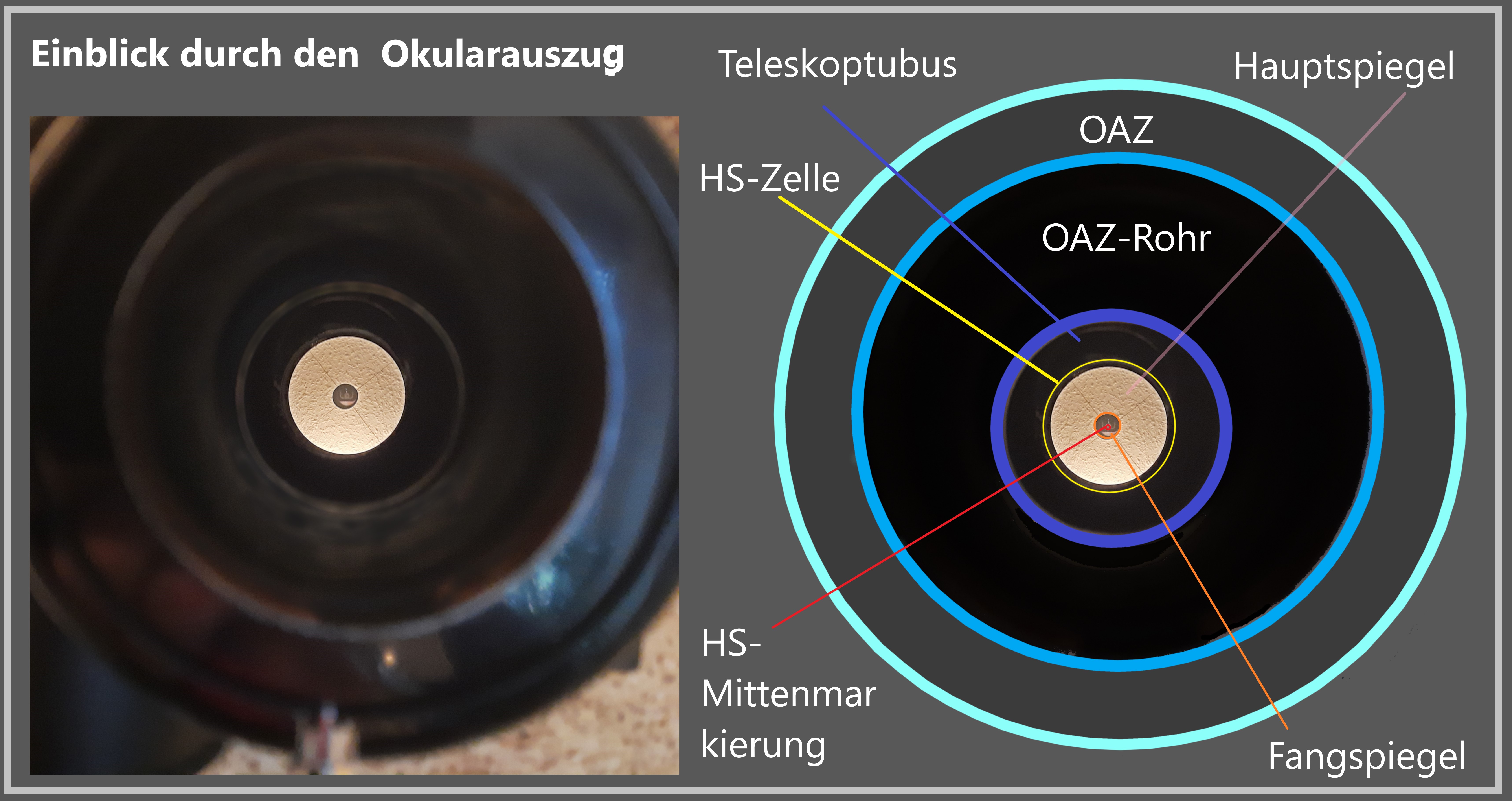 Was jetzt kommt, funktioniert nur, wenn der Newton funktionsgerecht gebaut ist, also nicht bei den Teilen die Aufhänger für diesen Artikel sind. Damit kann das gar nicht funktionieren und daher gibt es auch so viel Verwirrung um die eigentlich sehr einfache Justage von Newton Teleskopen. Der Aufbau, so wie in der nächsten Grafik gezeigt, muss zu sehen sein.